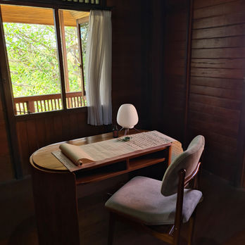 Dans une petite pièce isolée nous avons imaginé le bureau. Un espace sombre mais qui invite à l'inspiration et au rêve grâce aux deux fenêtres donnant sur la verdure ondulant au gré du vent... La brise s'engouffre dans la pièce et donne un nouveau souffle à votre activité.