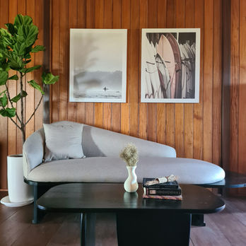 J'ai toujours été une grande fan des maisons en bois, je trouve qu'elles ont un charme et un caractère fou. L'étage supérieur de la maison accueille l'espace nuit avec 2 chambres, un dressing, 2 salles de bain et comme il restait beaucoup d'espace nous avons donc aménagé un coin salon et cosy. Mon client souhaitait apporter une ambiance surf et je trouve que cela se marie très bien avec le bois.
