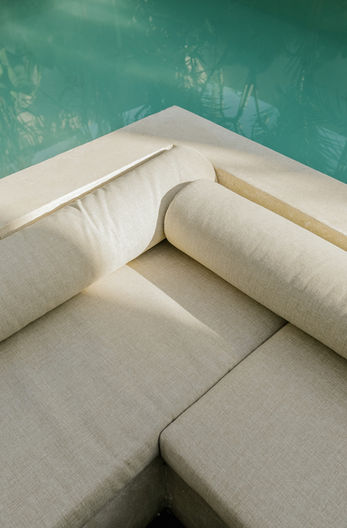The heartbeat of the home is a custom terrazzo planter integrated into the living space. This "mini-jungle" acts as a living architectural feature, blurring the lines between Bali’s lush outdoors and the refined interior. Paired with a bespoke reading nook and integrated shelving, it offers an intimate sanctuary within the open-plan design. In the main lounge, floor-to-ceiling recessed cabinetry flanks the TV, that complements the dual parallel sofas and square coffee tables.